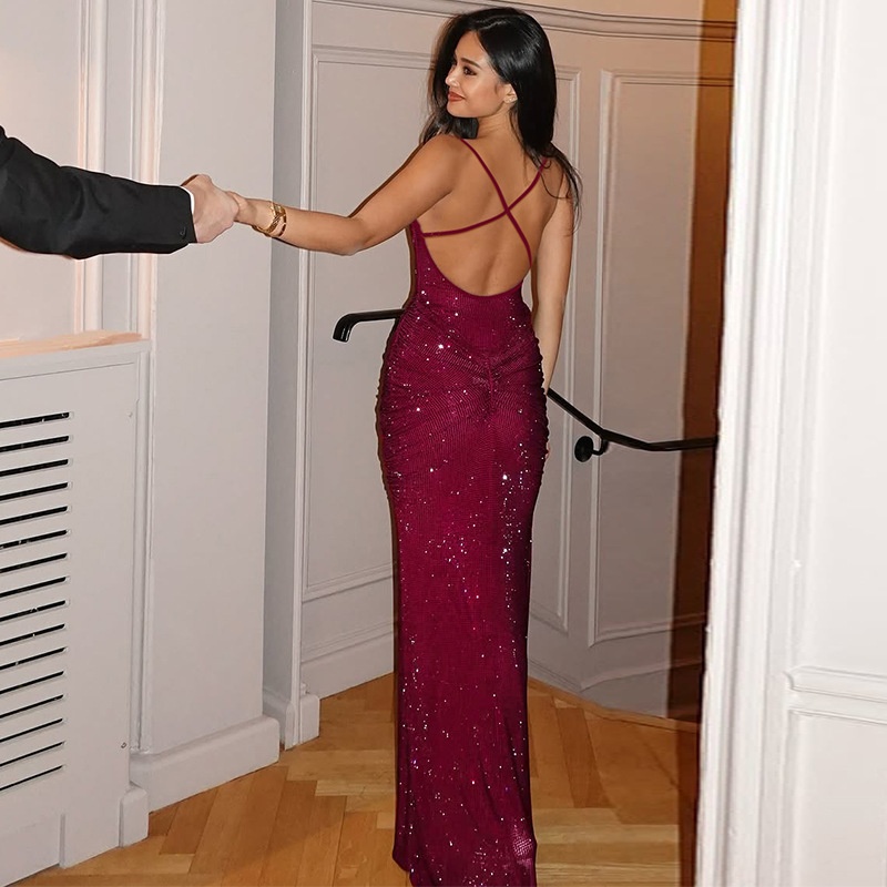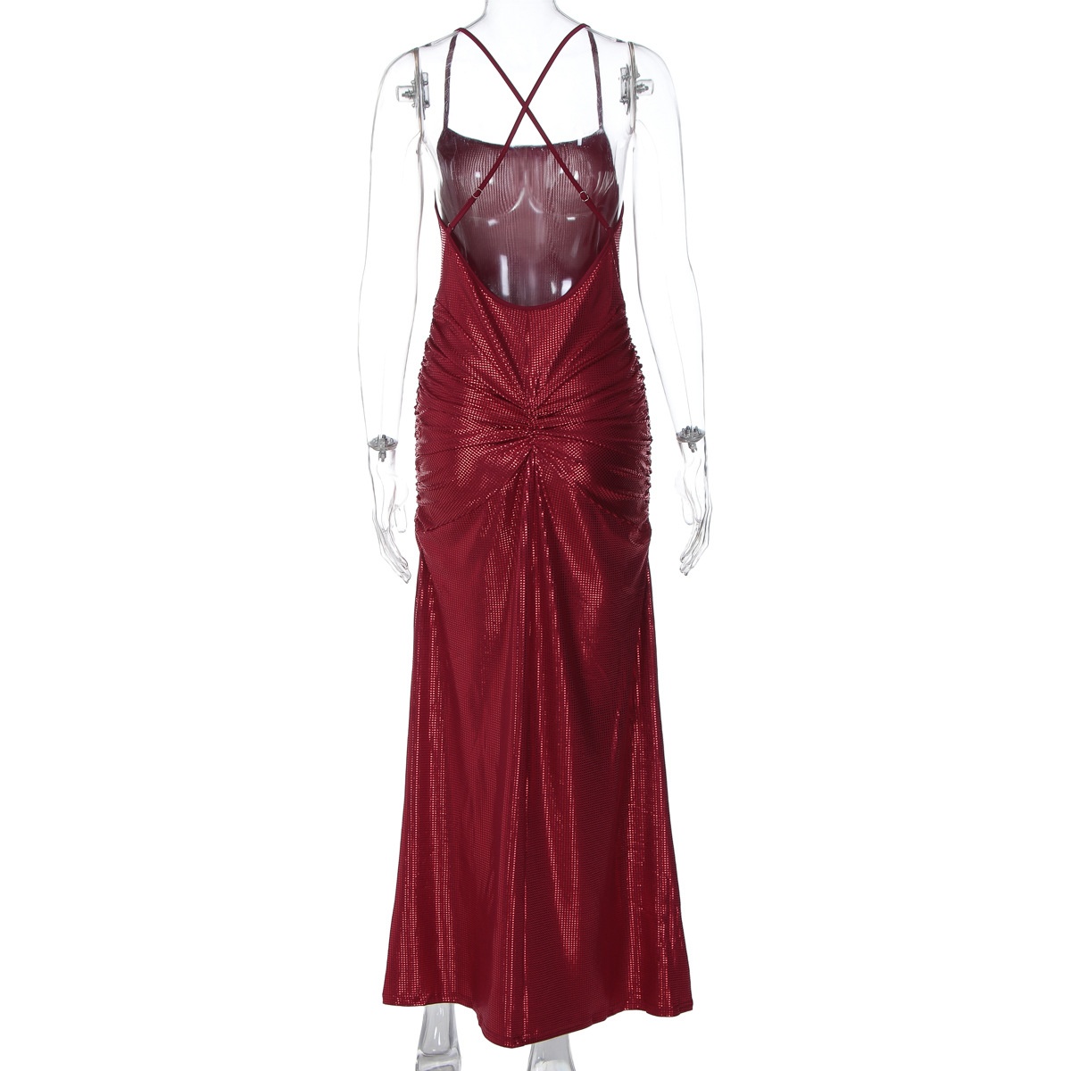 Women's Sexy Backless Gold-Embossed Pleated Bodycon Elegant Slip Dress